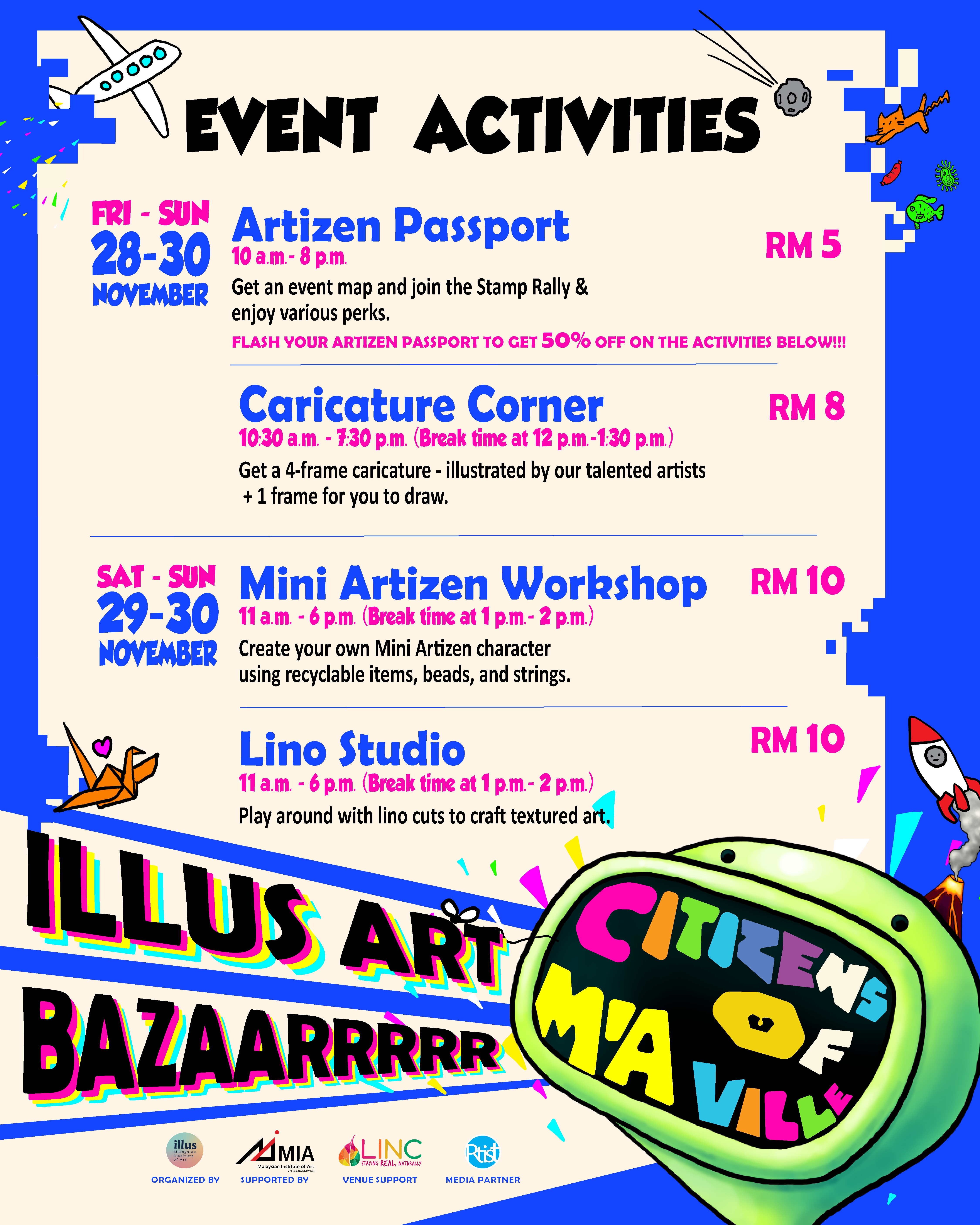 Citizens of MiaVille is a merchandising event organized by the students in the Illustration Department of MIA at The LINC KL. The event is happening on the 28th to 30th November 2025 (Friday-Sunday), featuring creative merchandise products by 50 illustrators, designers and animators.