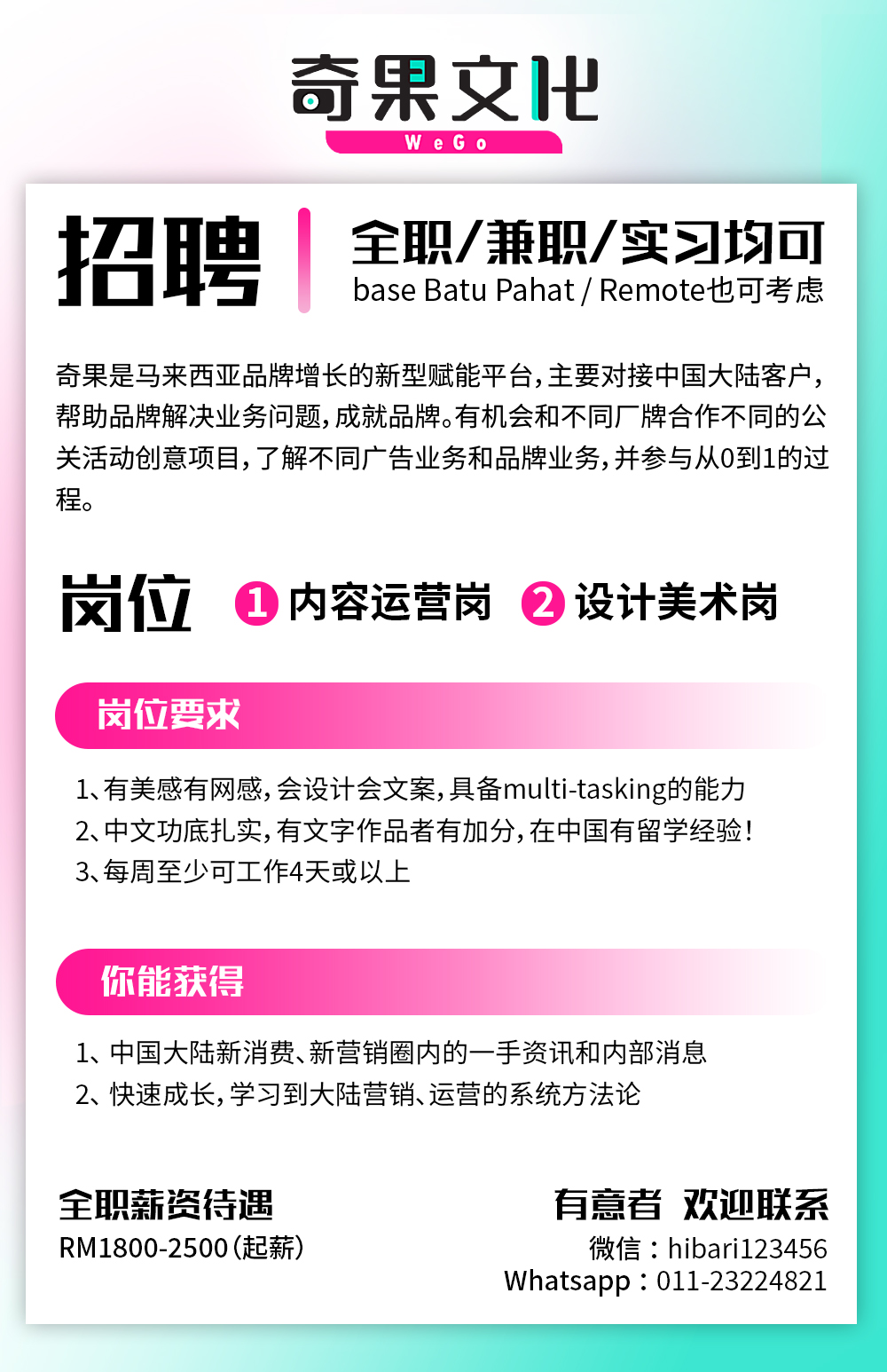 WEGO是一家协助中国企业进行公关、媒体业务的工作室,日常会协助企业进行平台运营,文案创作,海报设计,数据处理等等。现招聘几名广告平面设计的实习生/Freelancer,可远程工作